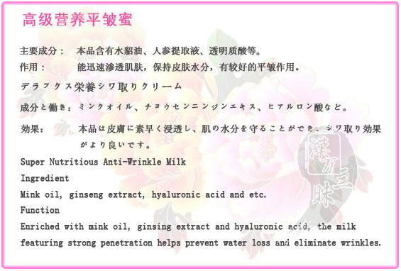 迷奇高級栄養平皺蜜とは、保湿しわ取りクリームです。しわ防止・除去・保湿、美白のトリプル効果がこの1本に凝縮されています。自然の香りが少々キツイかもしれないが、でも結果を求めている方には是非、お使いくだい。