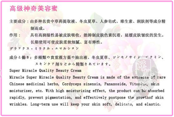 医者からさじを投げられるほどの顔のシミ、ソバカス、にきび跡を目立たなくします。 日焼けによるシミやソバカス、乾燥には特に効果的です。 第38回ユリカ世界発明博覧会で金賞を受賞するとともに、アメリカ食品医薬品局FDAの認可も受けた、きわめて安全性の高い化粧品です。