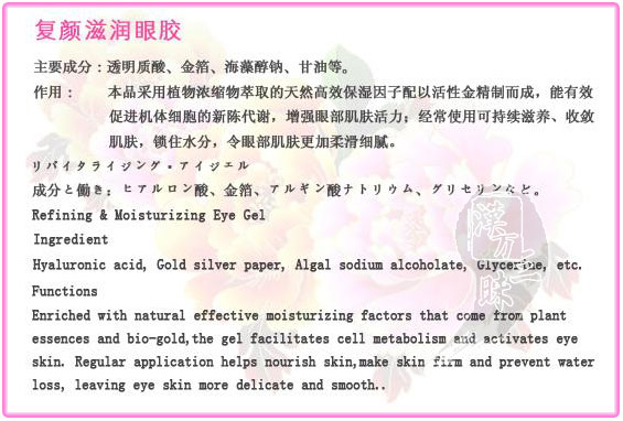 天然の保湿効果の高い植物のエキスと活性金を配合し、肌の細胞の新陳代謝を促進し目の周りの活力を増強します。毎日続けて使用することにより、肌が潤いハリが出て、キメ細やかな肌になります。