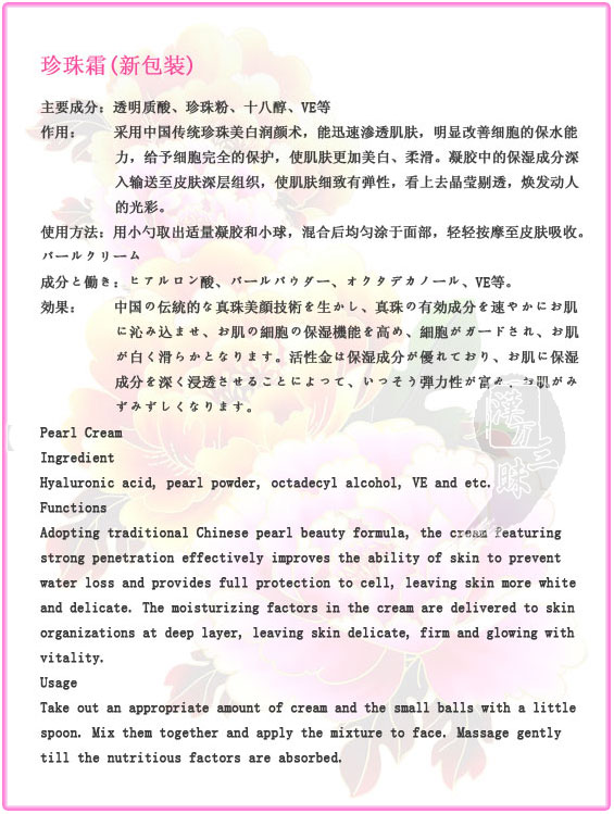 中国の伝統的な真珠美顔技術を生かし、速やかにお肌に沁み込ませ細胞の保湿能力を改善して細胞に完全の保護を与える。活性金の保湿成分はお肌の深層組織まで浸透させることよって、白く滑らかな張りのあるみずみずしいお肌にします。