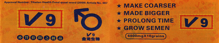 -------------------------------------------------------------------------------- ■V9をご使用前に必ずお読みください 【功能主治】:勃起迅速で、勇猛持久。当品がペニスのスポンジの体を急速に膨張させることができる、堅挺有力、薬効持久、効果が明顯。対陰莖短小、陽萎早泄、性功能の障害者はすべてとてもよい効果がある。 -------------------------------------------------------------------------------- ■V9のご使用方法 1回1カプセル、性行為前の10-30分前後に服用。 -------------------------------------------------------------------------------- ■V9の保管方法 気温15〜30℃で湿気が無く直射日光のあたらない場所で保管下さい -------------------------------------------------------------------------------- ■V9の賞味期限 商品梱包アルミに記載から約36ヶ月間。